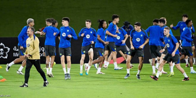 اجتمع الألماني هانزي فليك، مدرب فريق برشلونة الأول لكرة القدم، باللاعبين قبل بداية الحصة التدريبية، الثلاثاء على الملعب الرديف في مدينة الملك عبد الله الرياضية في جدة استعدادًا لمواجهة أتلتيك بلباو، الأربعاء في نصف نهائي كأس السوبر الإسباني.