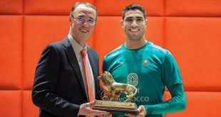 الدار البيضاء – متابعة سلم الزميل بدر الدين الإدريسي رئيس تحرير صحيفة “المنتخب”، اللاعب الدولي المغربي أشرف حكيمي جائزة “الأسد الذهبي”، التي توجته أفضل لاعب كرة قدم إفريقي لسنة 2024. وعند تسلمه لهذه الجائزة الفخرية، أبدى أشرف حكيمي سعادته بهذا التتويج، وقال: “أشكر جريدة “المنتخب”، على أنها خصتني …